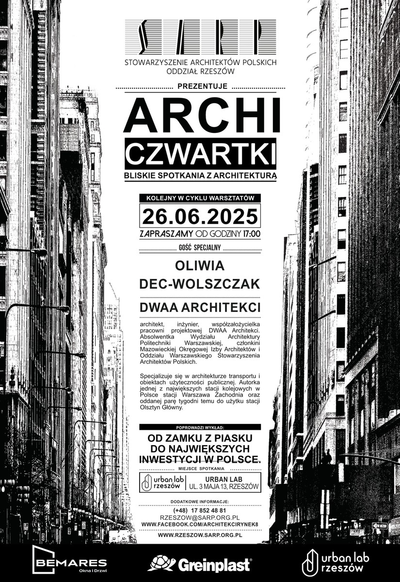 W imieniu SARP o. Rzeszów, w ramach bliskich spotkań z Architekturą „ARCHI – CZWARTKI” 26 czerwca 2025, godz. 17.00 w URBAN LAB przy ul. 3-go Maja 13 w Rzeszowie zapraszamy serdecznie na prelekcję: