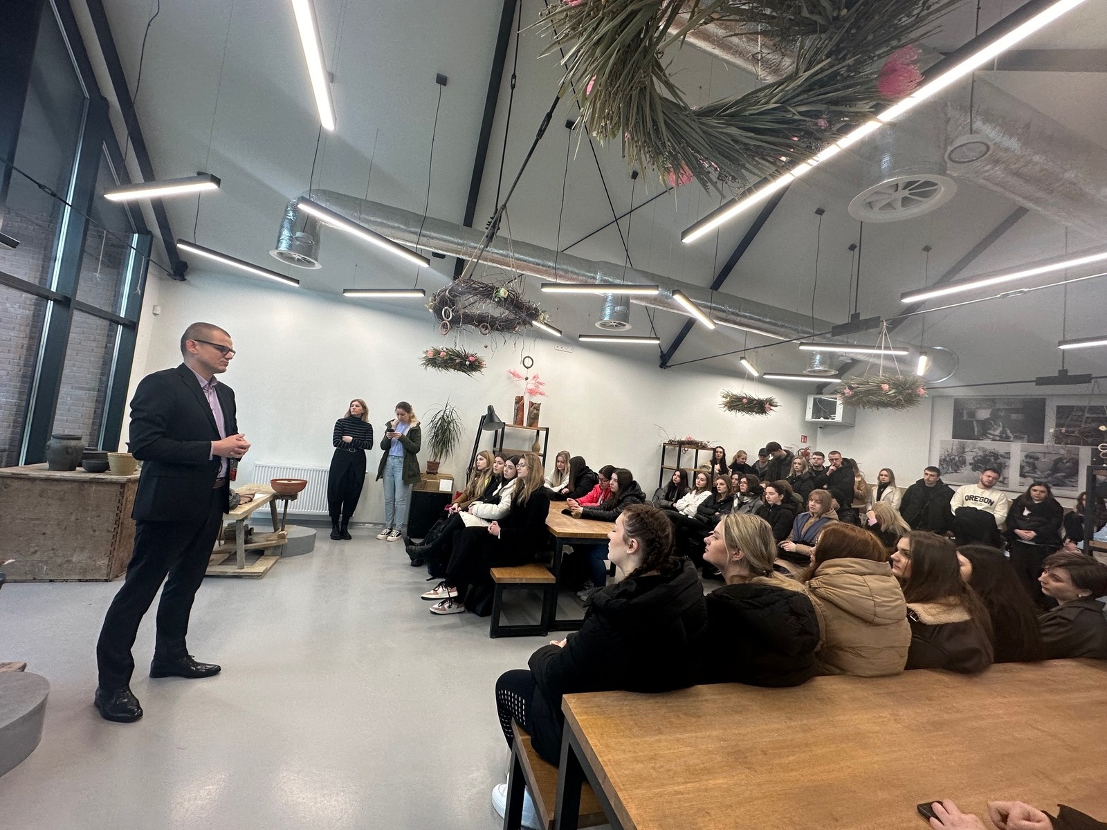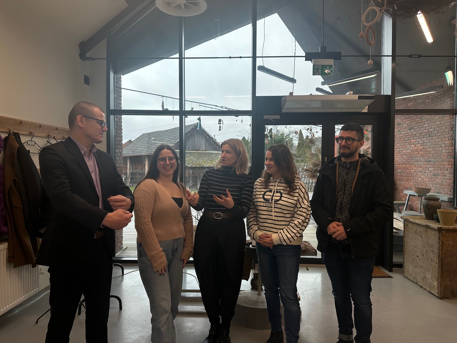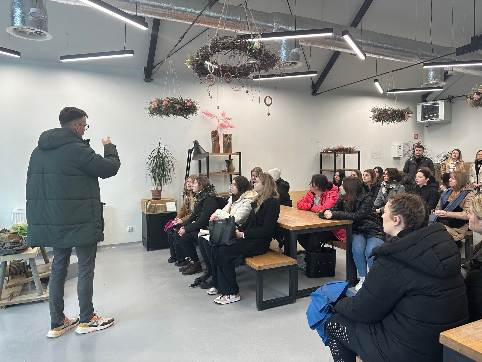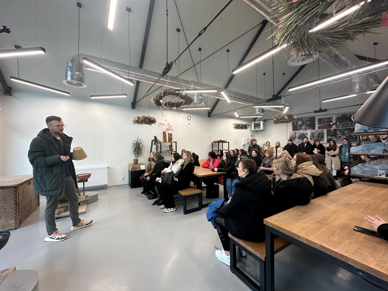 Po przybyciu do ośrodka garncarskiego, studenci mieli okazję uczestniczyć w rozmowach z specjalistami od ceramiki, zgłębiając proces produkcji oraz różnorodność rodzajów ceramiki. Następnie zwiedzili cały Ośrodek Garncarski, inspirując się jego architekturą, funkcjonalnością i atmosferą, co dodatkowo wzbogaciło ich doświadczenie oraz perspektywę projektową.